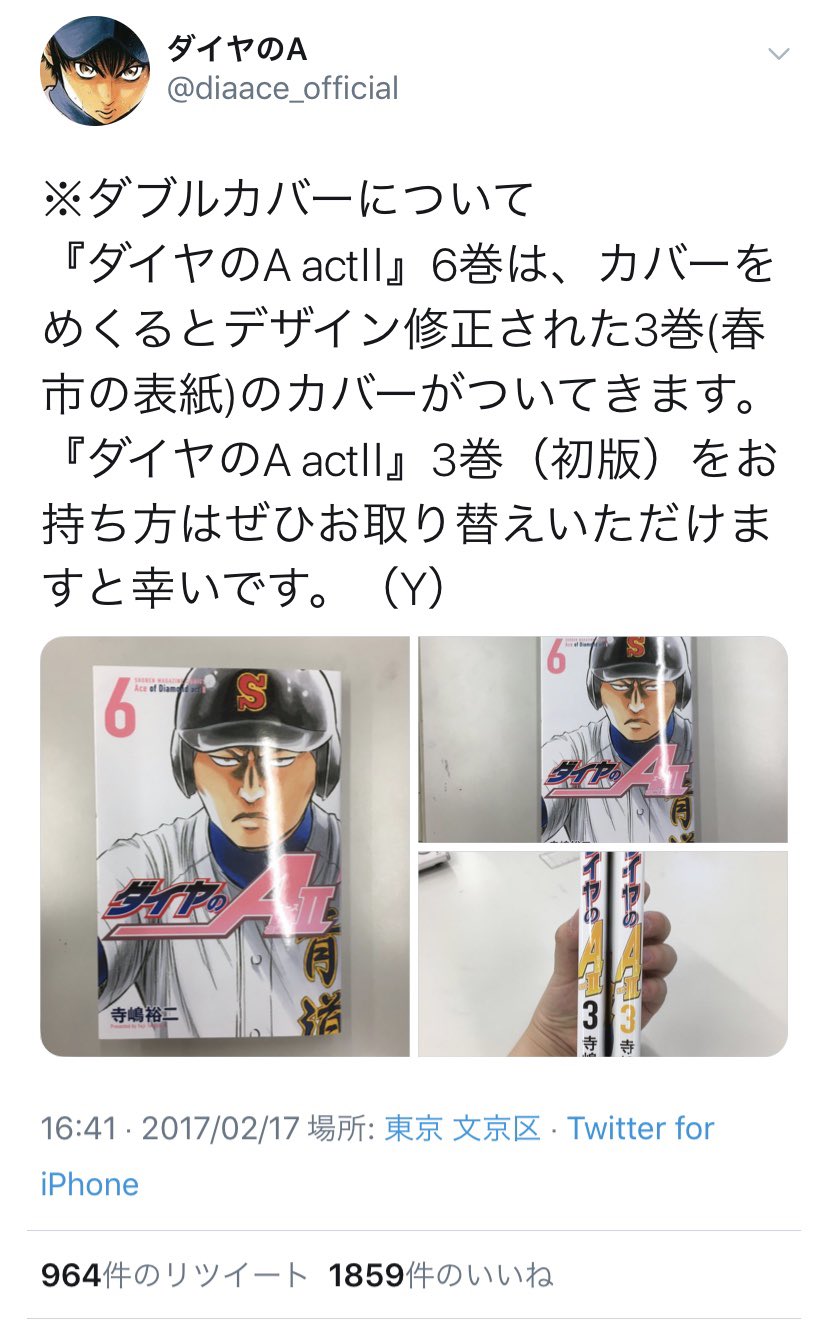 マニア堂 補足するとダイヤのa Act2は以降の巻のカバー下に修正された色合いのカバーを一緒に巻きつけて販売しました 素晴らしい対応ですね ムダヅモは作者名が4巻のみ黒色になってます 最終巻も作者名が黒ですが表紙が白いのでそちらは正しい 存外